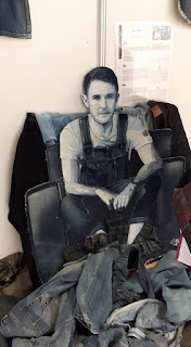While the European Patchwork Meeting takes place in several locations, I looked them all over and decided to focus on one location, that housed the SAQA exhibition, and the exhibition of a few other artists that I admire. I have to say that my very favorite exhibition was by London, UK artist, Ian Berry. Ian works strictly with denim and glue. A wide variety of values of denim create the depth and realism in his work. That is Ian on the left and his self-portrait on the right.